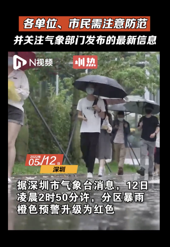 據(jù)廣東深圳市氣象臺(tái)消息,12日凌晨2時(shí)50分許,分區(qū)暴雨橙色預(yù)警升級(jí)為紅色,這也是深圳今年發(fā)布的首個(gè)暴雨紅色預(yù)警。截至12日早上,分區(qū)暴雨紅色、橙色、雷電、地質(zhì)災(zāi)害黃色多預(yù)警持續(xù)生效中,全市中小學(xué)及幼兒園停課。