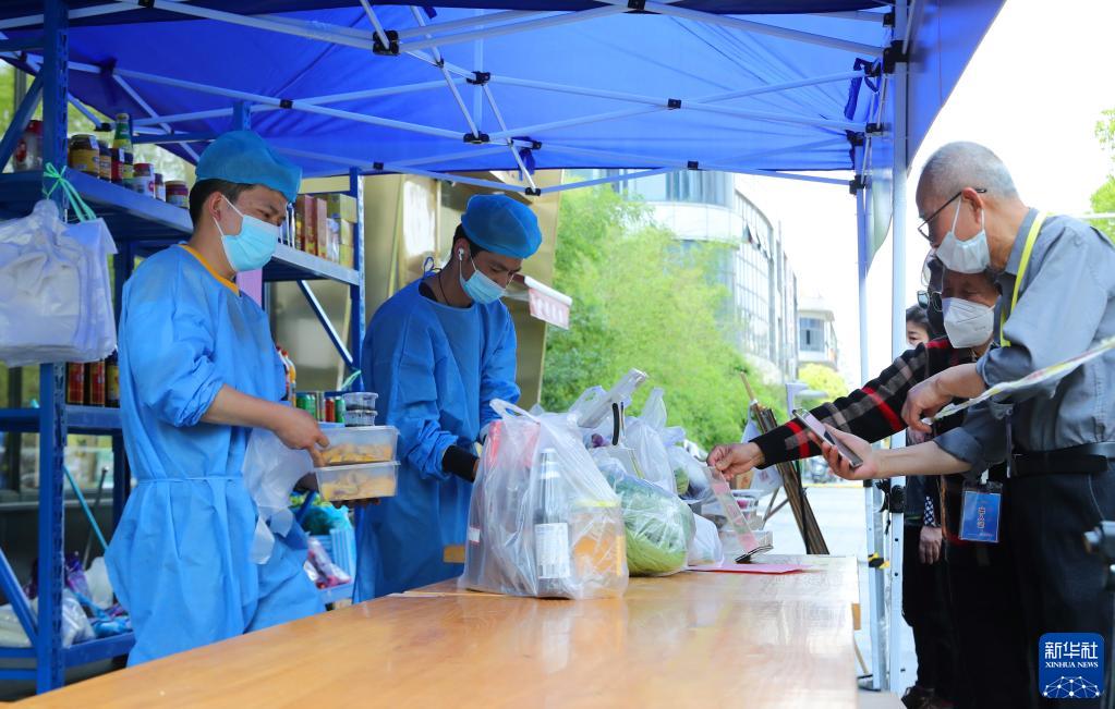 5月17日,市民在上海市嘉定區(qū)一家飯店的外賣攤位前掃碼購物。新華社記者 方喆 攝
