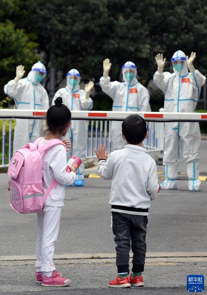 4月30日,走出醫(yī)院準(zhǔn)備回家時,小華(右)和姐姐回身向護(hù)送他們出院的醫(yī)護(hù)人員揮手道別。當(dāng)日,由上海交通大學(xué)醫(yī)學(xué)院附屬仁濟(jì)醫(yī)院南部院區(qū)(新冠定點醫(yī)院)收治的3歲重癥新冠患者小華(化名)出院。新華社記者 李賀 攝