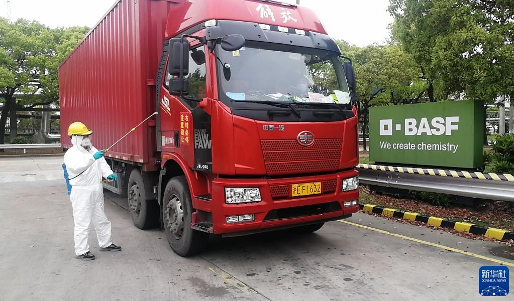工作人員在位于上海市金山區(qū)的巴斯夫護(hù)理化學(xué)品(上海)有限公司工廠對貨車進(jìn)行消殺(4月15日攝)。新華社記者 丁汀 攝