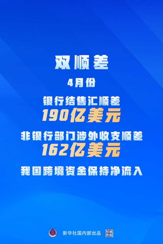 國家外匯管理局17日發(fā)布的數(shù)據(jù)顯示,4月份銀行結(jié)售匯順差190億美元,與一季度月均水平相當(dāng);非銀行部門涉外收支順差162億美元,環(huán)比增長57%。