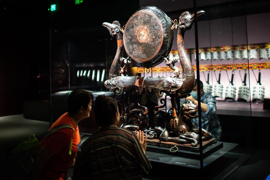 5月12日,在湖北省博物館,參觀者觀看展出的彩繪漆木虎座鳥(niǎo)架鼓。新華社記者 肖藝九 攝