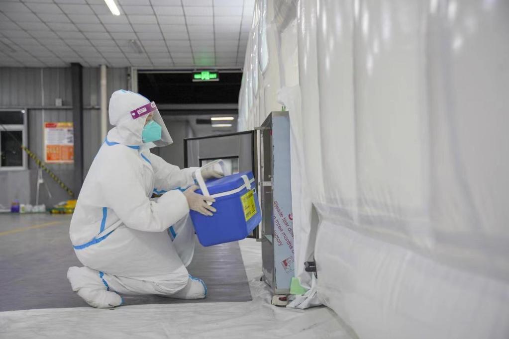 廣場一側(cè)的方艙流動檢測點,4臺移動核酸檢測車全速運轉(zhuǎn),手提樣本轉(zhuǎn)運箱的工作人員步履匆匆,將采集到的樣本及時送檢。