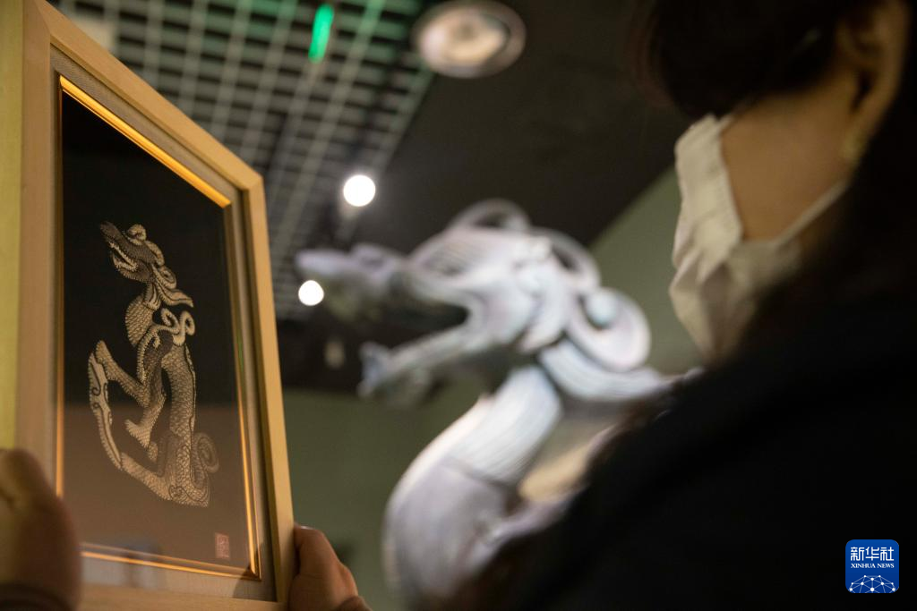 黑龍江省博物館內(nèi)展示的以銅坐龍為原型設(shè)計的魚皮畫(5月16日攝)。
