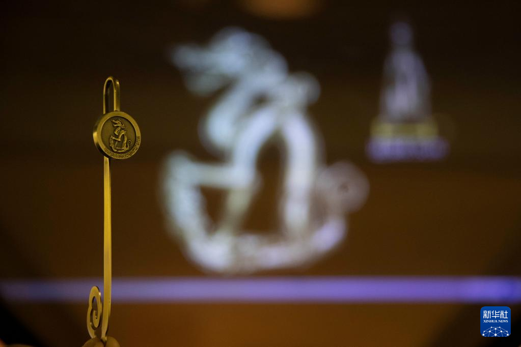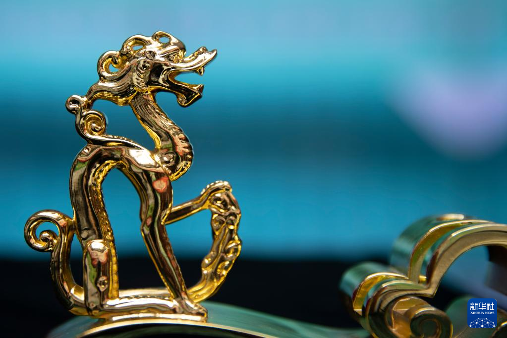 黑龍江省博物館內(nèi)展示的以銅坐龍為原型設(shè)計的云起龍驤案飾(5月16日攝)。