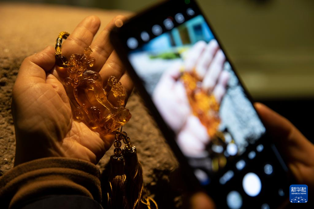5月16日,在黑龍江省博物館,工作人員拍攝以銅坐龍為原型設(shè)計的琉璃飾品。