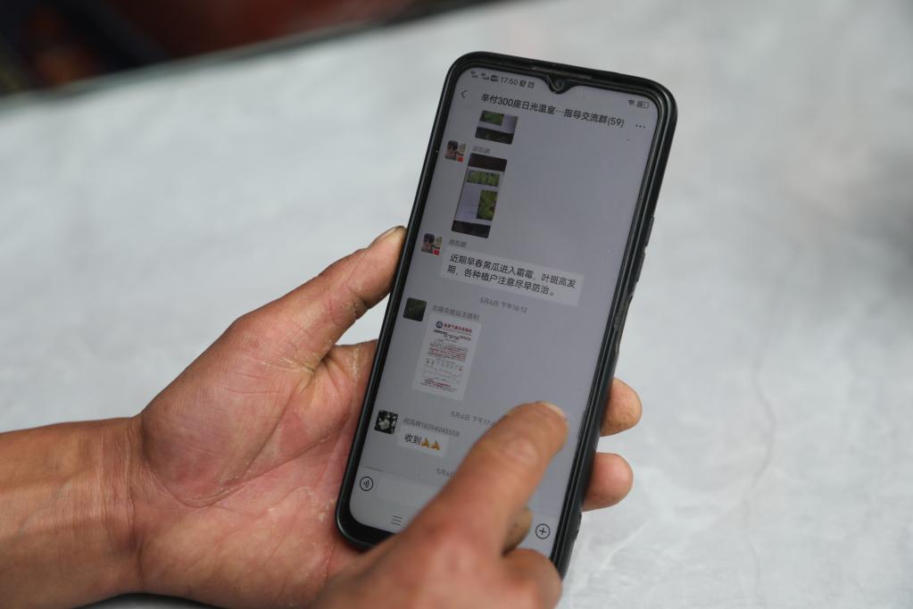 李珊珊展示“辛付村日光溫室指導(dǎo)交流群”。 新華社記者馬莎攝