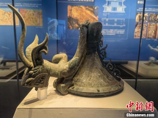 三星堆遺址三號祭祀坑出土的爬龍銅器蓋。 何浠 攝
