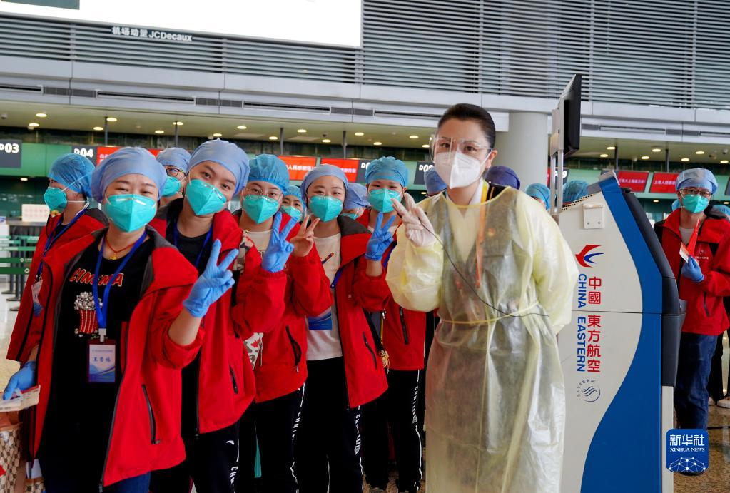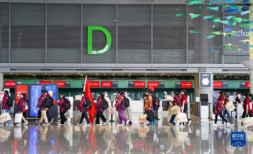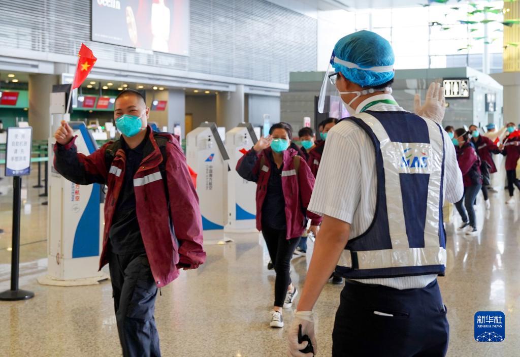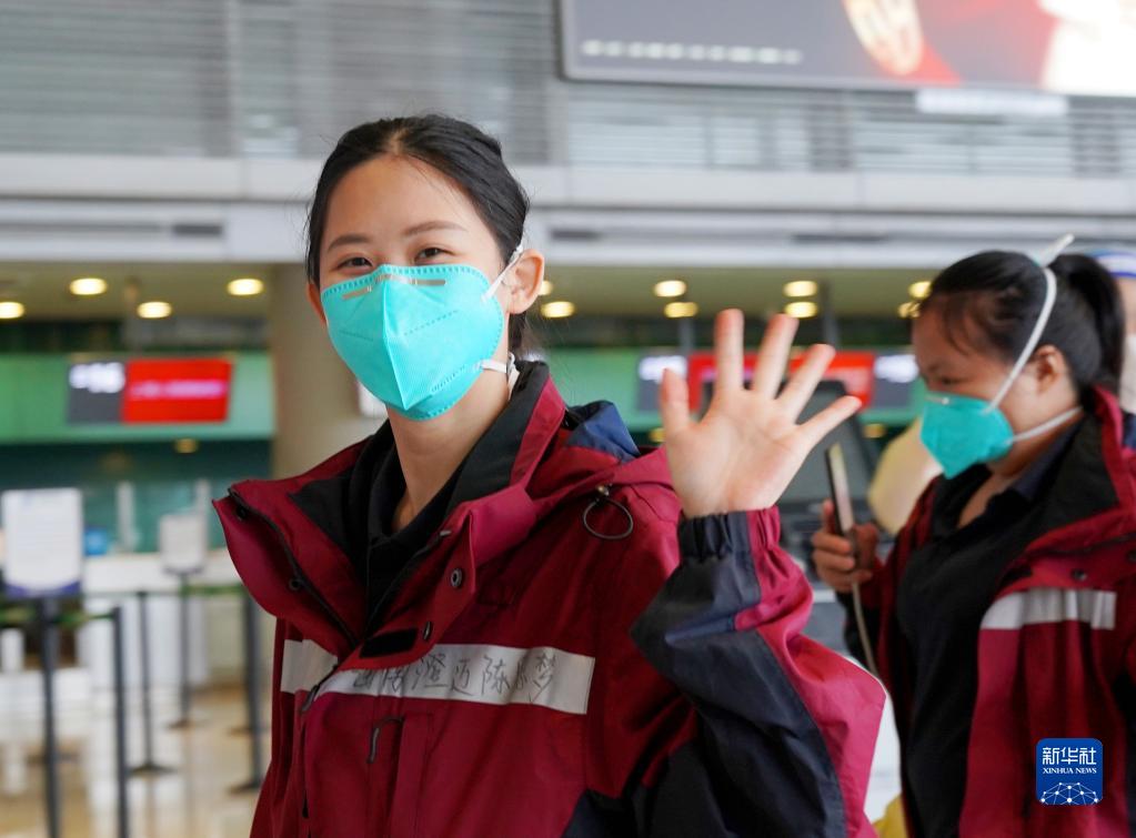 5月23日,在上海虹橋國際機(jī)場(chǎng),一名機(jī)場(chǎng)工作人員(右)向醫(yī)療隊(duì)隊(duì)員揮手道別。