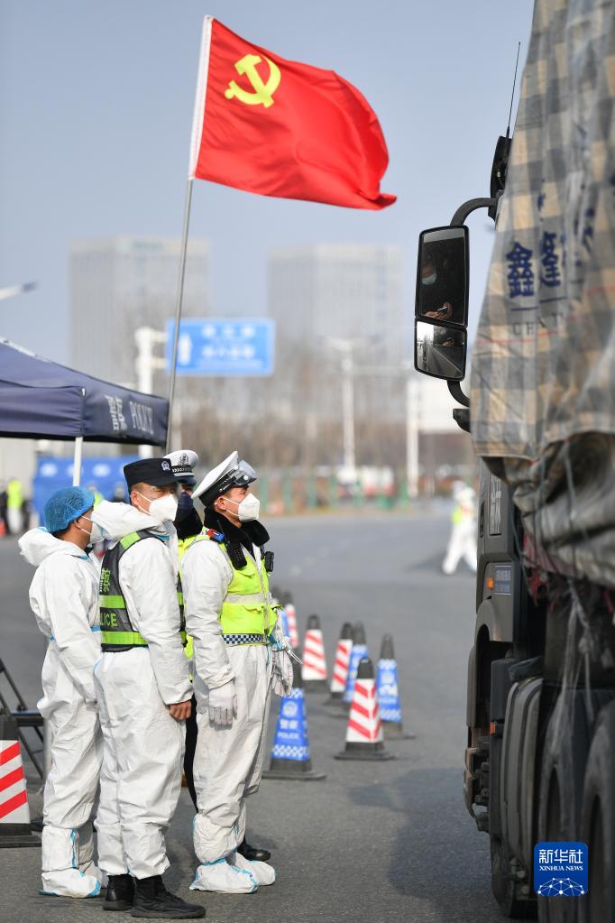 石家莊市公安局高新技術(shù)產(chǎn)業(yè)開發(fā)區(qū)公安分局民警在藁城區(qū)通往市區(qū)的路口執(zhí)勤(2021年1月10日攝)。當(dāng)日是首個(gè)“中國(guó)人民警察節(jié)”。新華社記者 楊世堯 攝