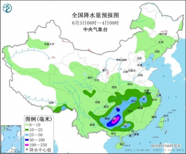 全國(guó)降水量預(yù)報(bào)圖(6月1日08時(shí)-2日08時(shí))