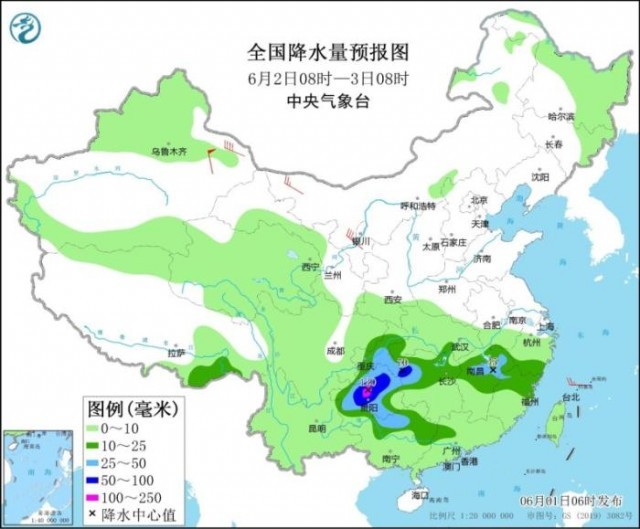 全國(guó)降水量預(yù)報(bào)圖(6月2日08時(shí)-3日08時(shí))