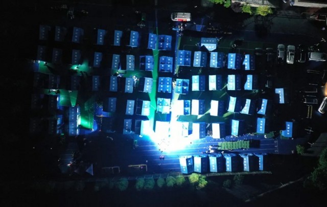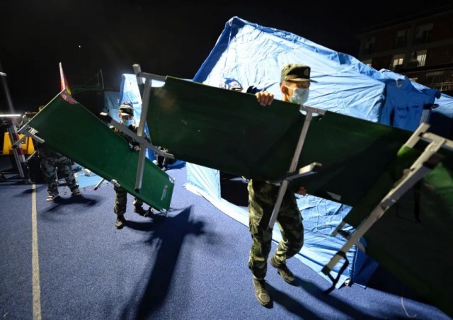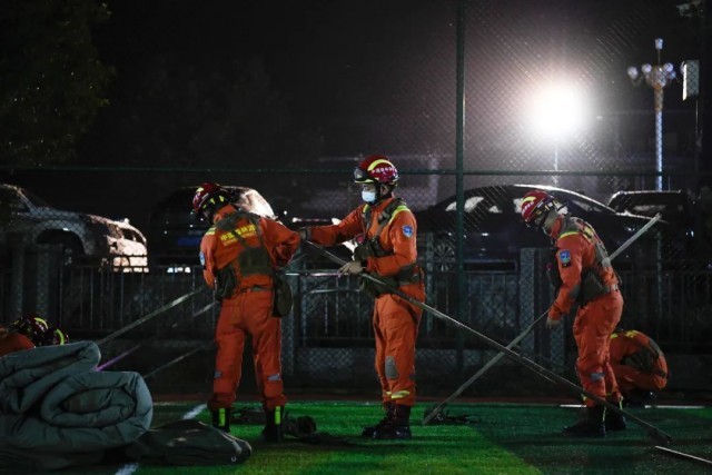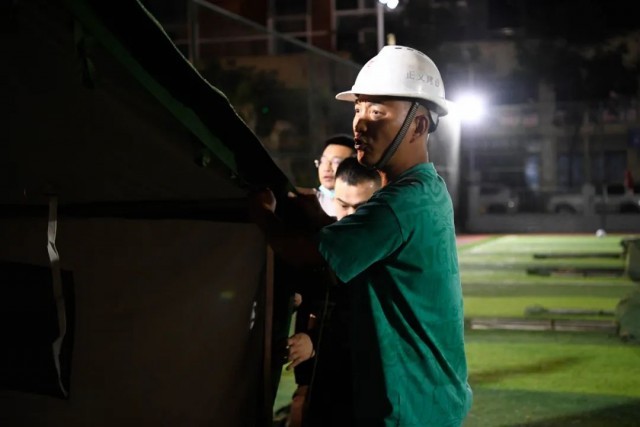 2日零點,在蘆山縣太平鎮(zhèn)太平中學安置點,記者看到,前方救援指揮部已經(jīng)組建運行,一批藍色帳篷已經(jīng)搭建完成,照明燈高高豎起,飲用水、方便面、棉被等物資已經(jīng)到位并有序分發(fā),醫(yī)療隊正展開現(xiàn)場工作。首批進入安置點的老人、婦女、兒童以及在校學生被優(yōu)先安排住進帳篷,一些年輕人主動幫助救援人員繼續(xù)搭建帳篷、分發(fā)物資。