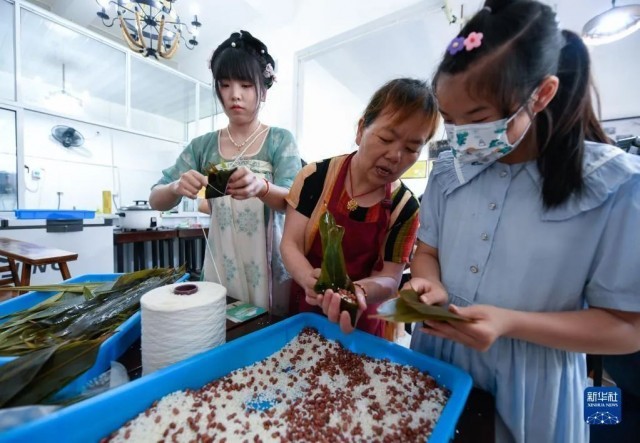 6月3日,游客在杭州市余杭區(qū)瓶窯老街的宋韻游園會上學(xué)包粽子。新華社記者 徐昱 攝