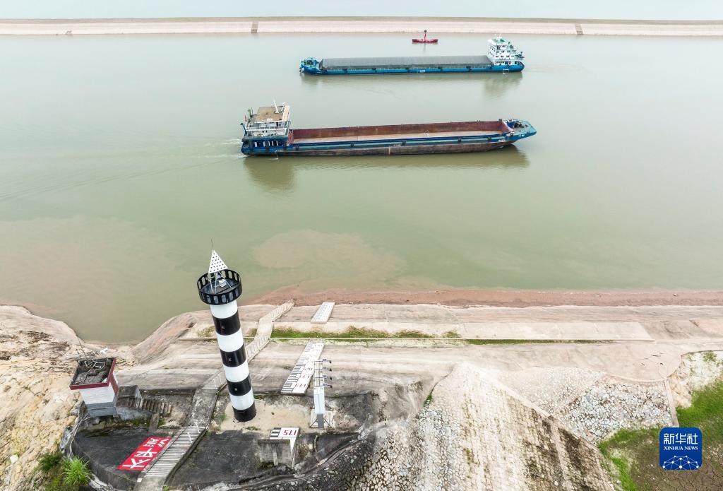 6月9日,船舶從三峽大壩上游太平溪水文標(biāo)尺前駛過(guò)(無(wú)人機(jī)照片)。