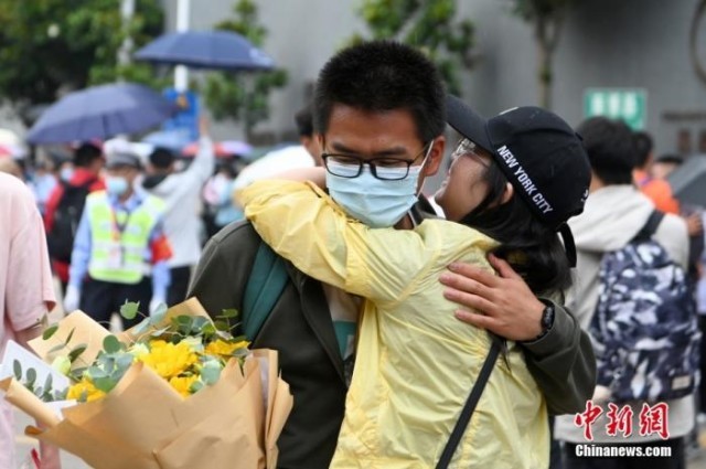 6月8日,一名考生在考點(diǎn)外與家長相擁。當(dāng)日,云南省2022年高考落幕。 中新社記者 李嘉嫻 攝