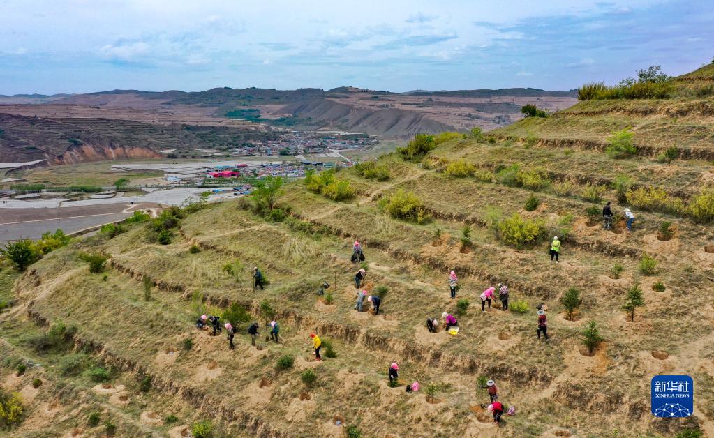 5月18日,人們在寧夏固原市西吉縣硝河鄉(xiāng)栽植苗木(無人機照片)。新華社記者 馮開華 攝