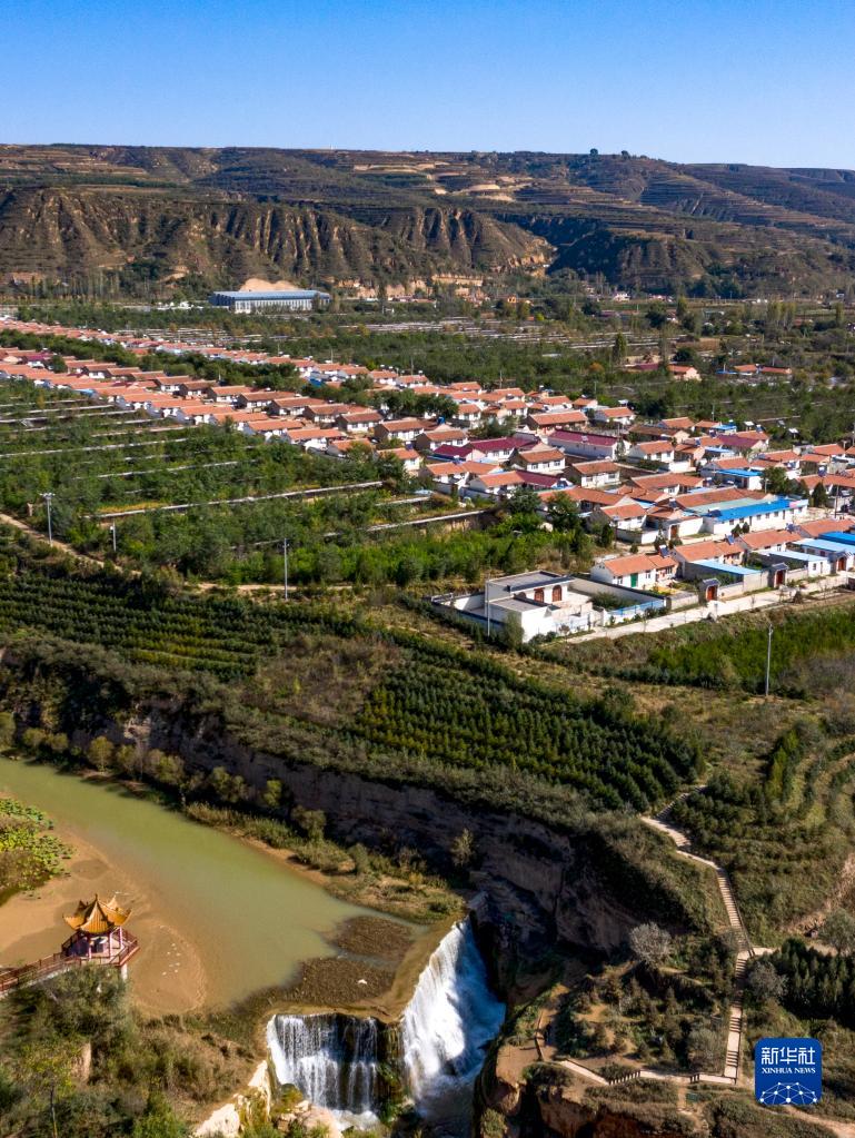 流經(jīng)寧夏固原市彭陽縣城陽鄉(xiāng)的茹河,因地殼變化和河床運動形成旱塬上的瀑布,當?shù)匾源税l(fā)展鄉(xiāng)村旅游(2019年10月12日攝,無人機照片)。新華社記者 馮開華 攝