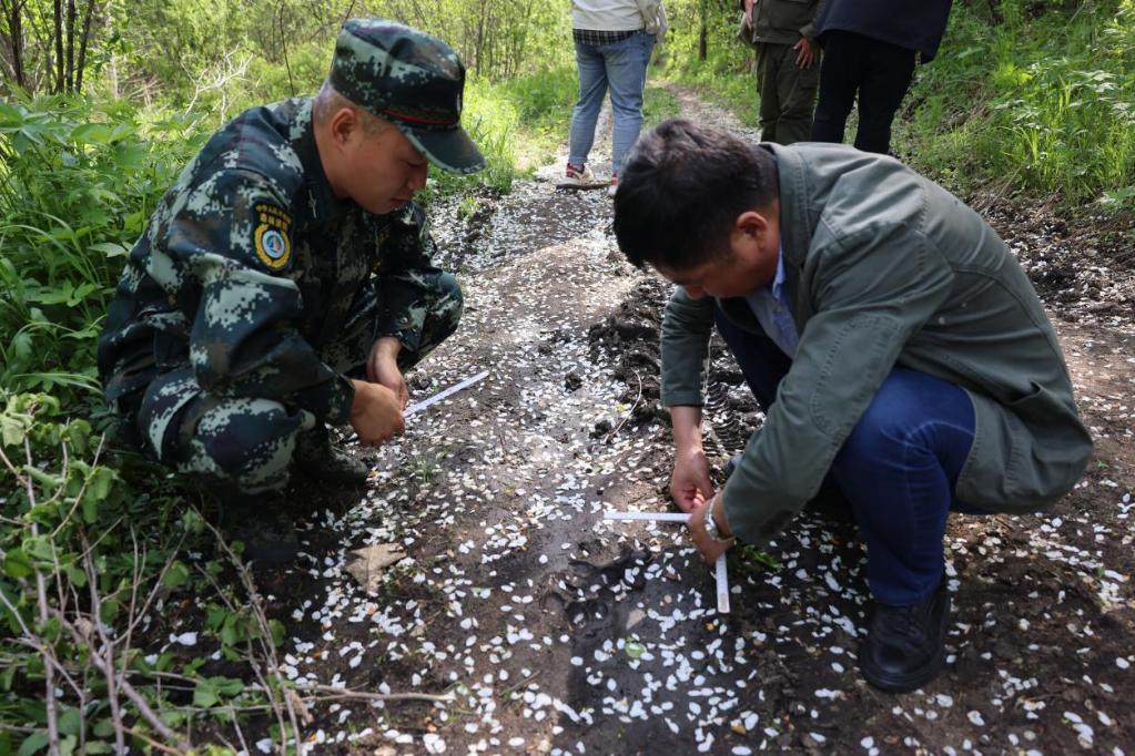 5月30日,穆棱東北紅豆杉國家級自然保護(hù)區(qū)工作人員測量“完達(dá)山1號”足印。(受訪者供圖)