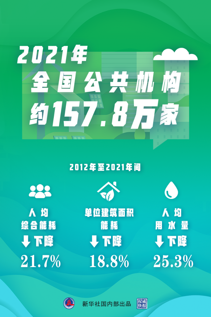新華社北京6月13日電,據(jù)初步統(tǒng)計,2021年全國公共機構(gòu)人均綜合能耗、單位建筑面積能耗、人均用水量與2012年相比分別下降21.7%、18.8%、25.3%。