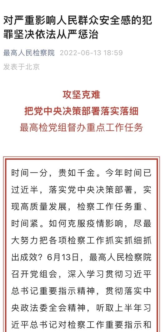 中國(guó)網(wǎng)6月13日訊 據(jù)最高人民檢察院官方微信公眾號(hào)消息,6月13日,最高人民檢察院召開(kāi)黨組會(huì),深入學(xué)習(xí)貫徹習(xí)近平總書(shū)記重要指示精神,貫徹落實(shí)中央政法委全會(huì)精神,聽(tīng)取上半年習(xí)近平總書(shū)記對(duì)檢察工作重要指示和《中共中央關(guān)于加強(qiáng)新時(shí)代檢察機(jī)關(guān)法律監(jiān)督工作的意見(jiàn)》落實(shí)情況,結(jié)合重點(diǎn)工作任務(wù)“把脈問(wèn)診”,研究討論做好檢察環(huán)節(jié)服務(wù)保障經(jīng)濟(jì)社會(huì)高質(zhì)量發(fā)展、維護(hù)社會(huì)和諧穩(wěn)定的舉措。最高檢黨組書(shū)記、檢察長(zhǎng)張軍主持會(huì)議并提出工作要求。
