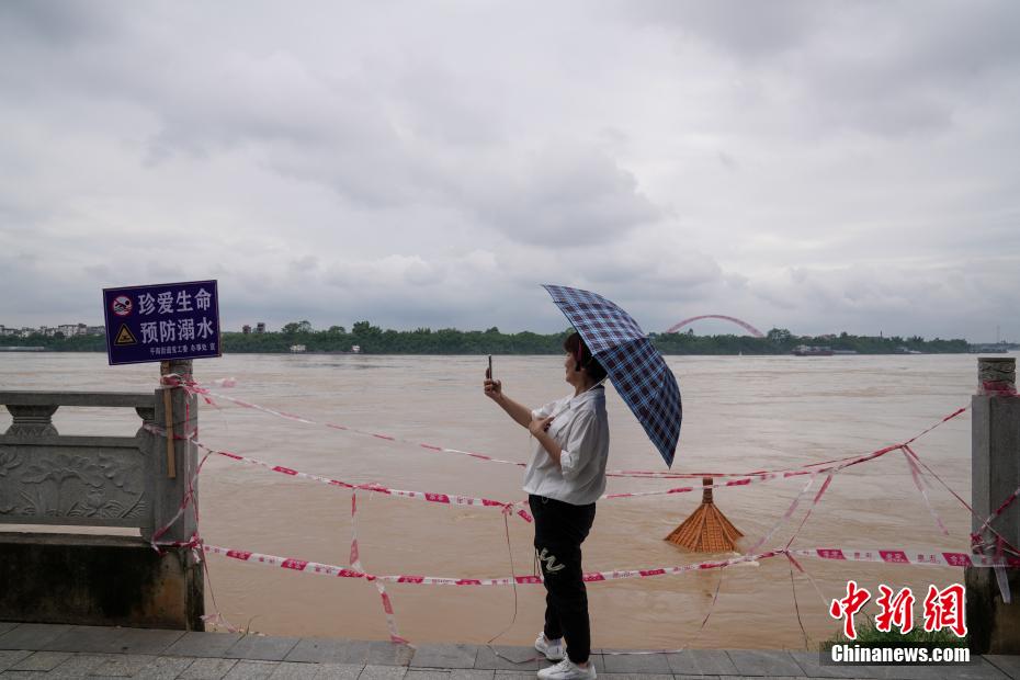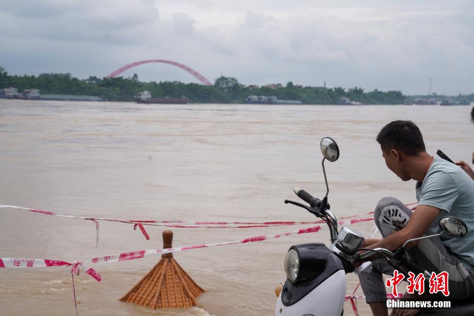 6月14日12時(shí),潯江廣西貴港市平南水文站水位30.69米,超警戒水位1.69米,沿岸涼亭被洪水淹沒。預(yù)計(jì)潯江貴港平南河段將于15日凌晨出現(xiàn)31.20米左右的洪峰。未來2天,當(dāng)?shù)刂饕訉?huì)保持在超警戒以上高水位運(yùn)行。潯江是珠江流域西江干流中游河段,當(dāng)?shù)卣雅沙鋈藛T下沉一線做好安全防范工作。一位平南市民在岸邊觀看洪水過境。 王以照 攝