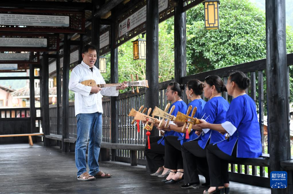 6月15日,在廣西三江侗族自治縣林溪鎮(zhèn)冠洞村,當(dāng)?shù)卮迕窠o一名來(lái)客(右二)介紹侗族琵琶彈奏技巧。