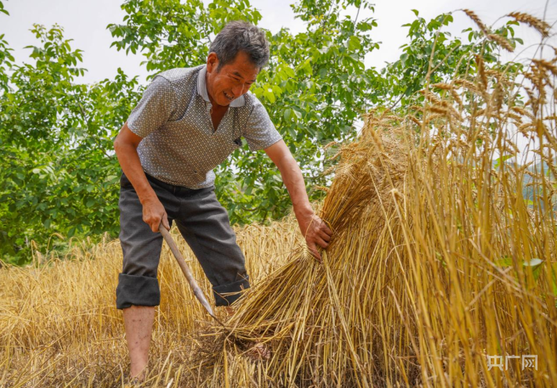 甘肅成縣索池鎮(zhèn)大川村村民正在山地丘陵地區(qū)人工搶收小麥