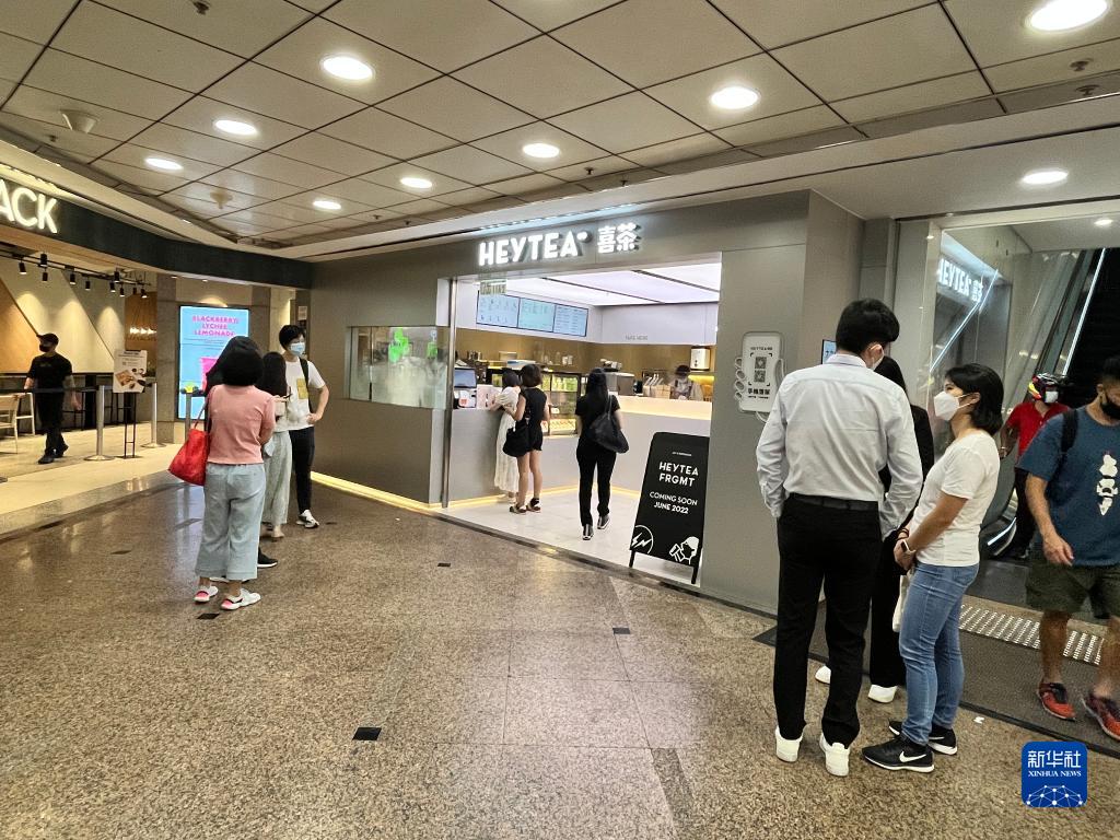 在香港銅鑼灣時代廣場,內(nèi)地新茶飲品牌喜茶的店面前聚滿了等待取單的年輕人。歐嘉祺和先生點(diǎn)了一杯芒果茶。