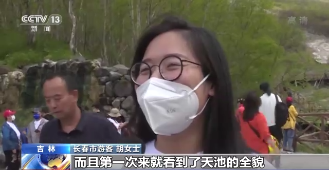 長春市游客 胡女士:特別宏偉、壯觀,而且第一次來就看到了天池的全貌,一半有冰,一半沒有冰,有冰的部分晶瑩剔透,沒有冰的那一側與天相襯,瓦藍瓦藍的特別壯觀。