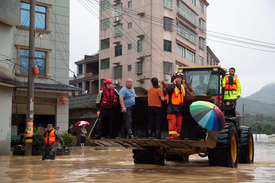6月18日,在福建省松溪縣河?xùn)|鄉(xiāng)長巷村,救援人員利用鏟車轉(zhuǎn)移被困群眾。 (吳振偉 攝)