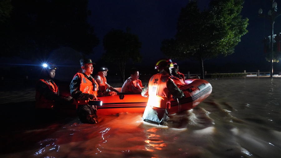 6月18日晚,武警福建省總隊南平支隊官兵使用皮筏艇轉(zhuǎn)移被困群眾。 (張陳宇 攝)