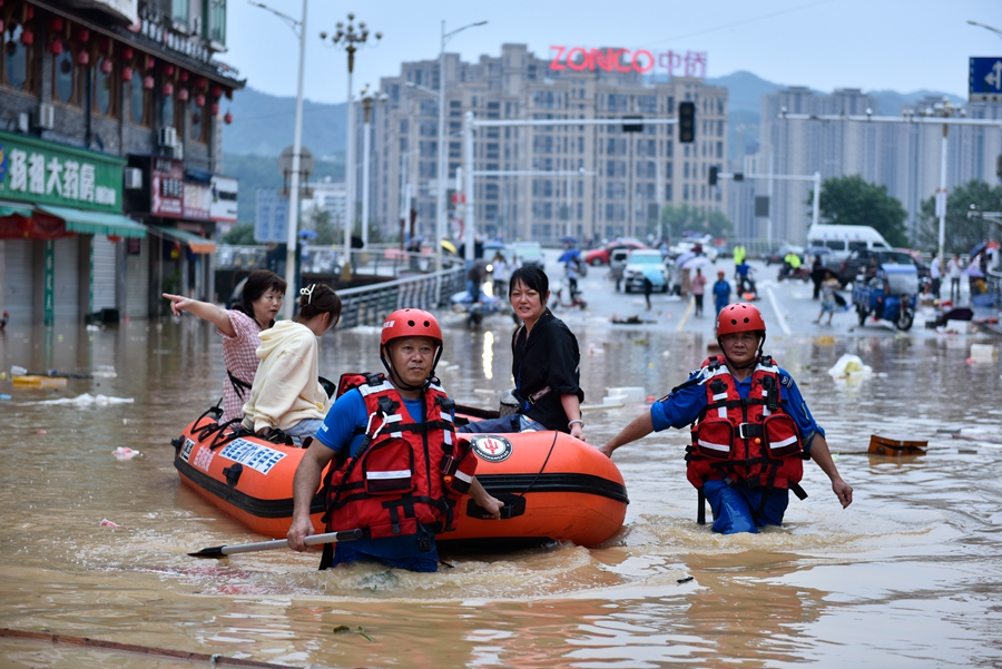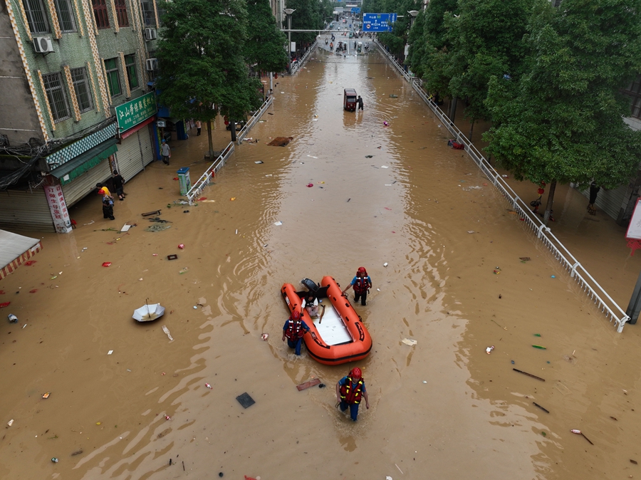 6月19日,在福建省建甌市水南橋附近,藍(lán)豹救援隊利用橡皮艇轉(zhuǎn)移被困群眾。 (黃杰敏 攝)