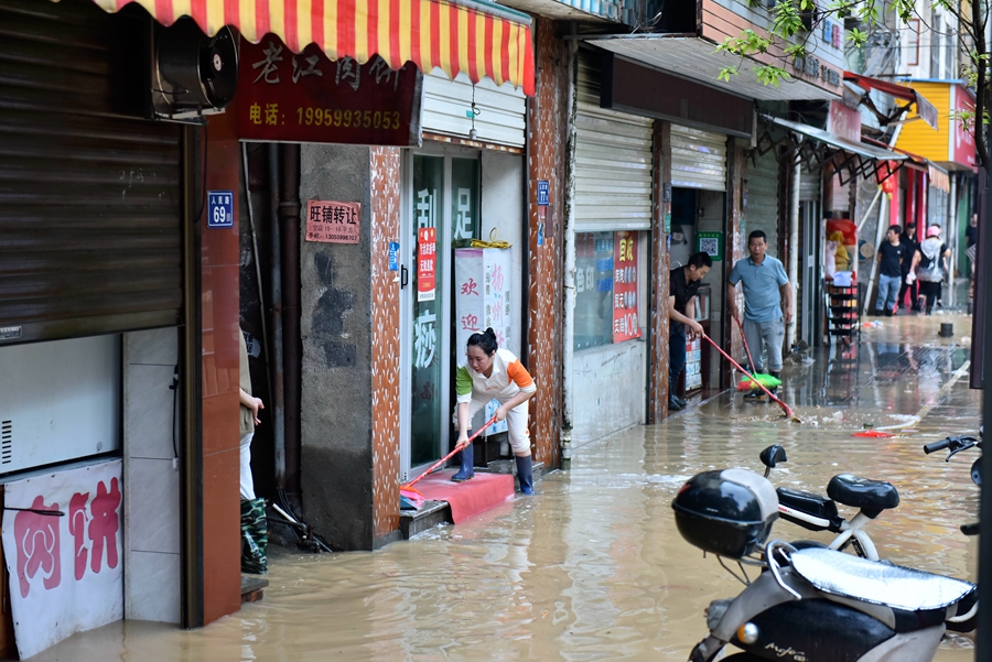6月19日,在福建省建甌市一處街道,居民進(jìn)行清淤工作。 (黃杰敏 攝)