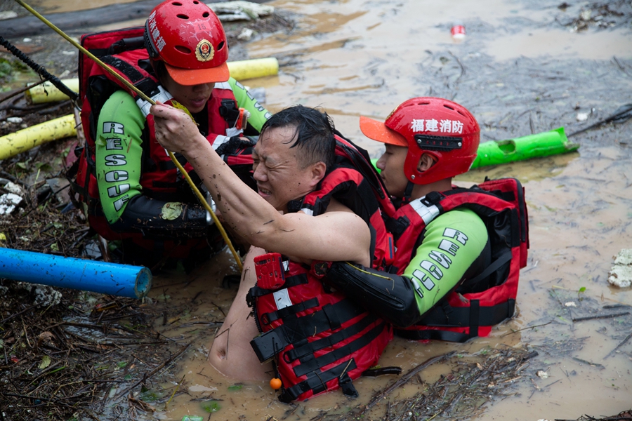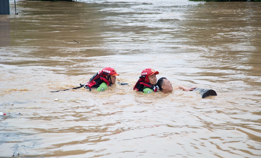 6月18日,消防救援人員在福建省松溪縣河?xùn)|鄉(xiāng)下畬村河段營救被困群眾。 (吳振偉 攝)