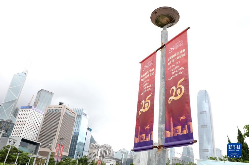 香港街頭的慶祝香港回歸祖國(guó)25周年海報(bào)(6月19日攝)。隨著香港回歸祖國(guó)25周年紀(jì)念日臨近,喜慶的紅色遍布城市的街頭巷尾。新華社記者 吳曉初 攝