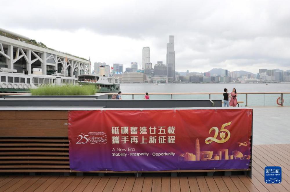 6月19日在海邊拍攝的慶祝香港回歸祖國(guó)25周年海報(bào)。隨著香港回歸祖國(guó)25周年紀(jì)念日臨近,喜慶的紅色遍布城市的街頭巷尾。新華社記者 吳曉初 攝
