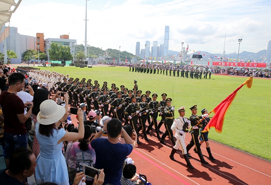 那一天的中區(qū)軍用碼頭上,駐香港部隊(duì)陸??杖姽俦碚R列隊(duì),莊嚴(yán)肅立。伴隨著“升國(guó)旗,唱國(guó)歌”的嘹亮口令,掌旗員甩動(dòng)臂膀,迅速將五星紅旗在空中展開(kāi),護(hù)旗方隊(duì)齊刷刷地舉槍向國(guó)旗敬禮。