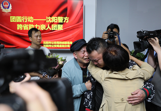 2021年6月6日,遼寧沈陽,小杰(化名)與父母相擁而泣。在全國公安機(jī)關(guān)開展的“團(tuán)圓”行動(dòng)中,沈陽市公安局刑偵禁毒局聯(lián)合皇姑分局,成功幫助貴州省貴陽市一對夫婦找回了失散26年的兒子小杰。中新社記者 于海洋/攝 視覺中國供圖