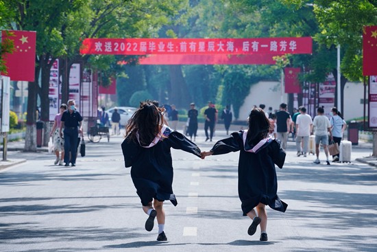 山西師范大學,兩位畢業(yè)生帶著母校的祝福奔跑。 中青校媒記者 禹成炎/攝