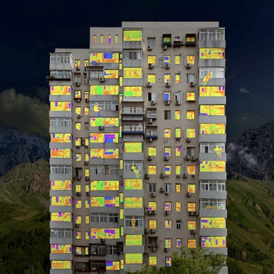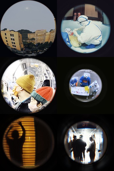 這組作品的創(chuàng)作起點,是我在隔離中透過貓眼看到的一個穿著防護服的背影。百年不遇的疫情之下,不同個體都棲息于密閉的空間中,人們的生活狀態(tài),構(gòu)成了參差交錯的世相之邦。這是個人的一段真實體驗、心路歷程,也展現(xiàn)了無數(shù)個表面的禁錮之下、內(nèi)在的自發(fā)蓬勃生命力。