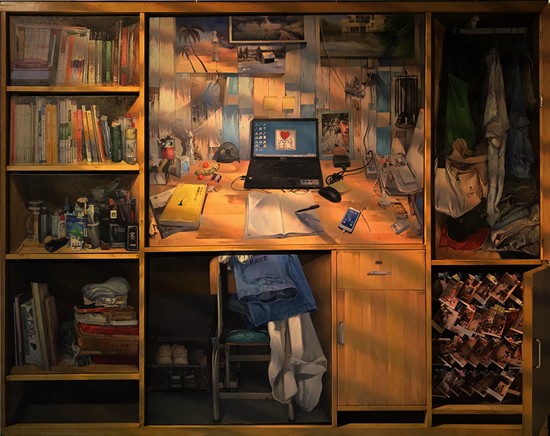 這幅作品按照1∶1的比例真實地還原了我大學宿舍書桌的原貌。它承載了大學4年生活的回憶,書桌上的物品反映出我們學習與生活的態(tài)度。