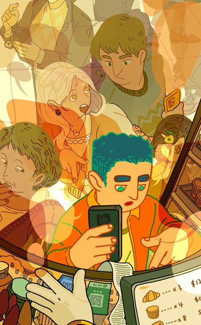 新冠肺炎疫情暴發(fā)以來,很多看似微小的事件都讓我真切地感受到了遭遇疫情的措手不及,所以我用電影默片般的黑白來傳達“停滯”“沉默”等狀態(tài)和情緒,畫面中有顏色的部分則是我認為當下需要面對的事物和遵守的規(guī)則。前面的景象既然到來了,就不必再回頭看,我們都需要在新的節(jié)奏中以新的方式好好生活。