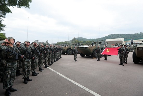 駐香港部隊某旅裝步一連組織官兵向黨旗宣誓。 易定/攝