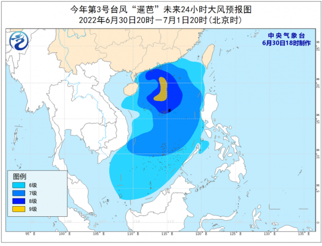 大風(fēng)預(yù)報(bào):30日20時(shí)至7月1日20時(shí),南海大部、廣東沿海、海南島東部和南部沿海、西沙和中沙群島附近海域?qū)⒂?-8級(jí)大風(fēng),臺(tái)風(fēng)中心經(jīng)過的附近海域或地區(qū)風(fēng)力可達(dá)9-10級(jí),陣風(fēng)11-12級(jí)。