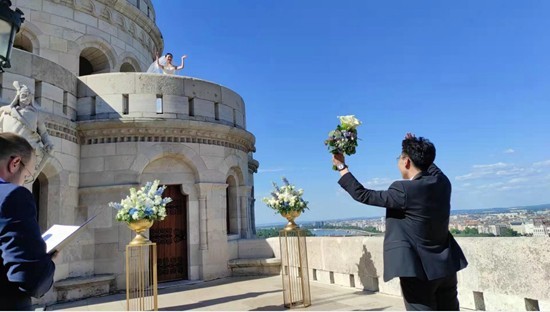 當?shù)貢r間6月23日,匈塞鐵路員工王道泊和劉凱悅在匈牙利布達佩斯舉行婚禮。(受訪者供圖)