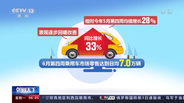 最新數(shù)據(jù)顯示,6月第四周乘用車市場零售達(dá)到日均7.0萬輛,同比增長33%,表現(xiàn)逐步回暖改善,相對(duì)今年5月第四周均值增長28%。