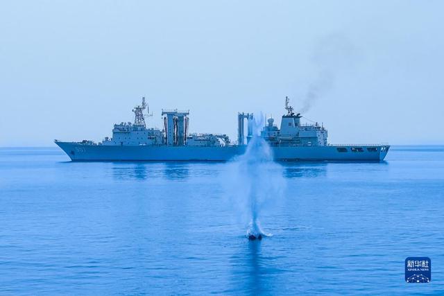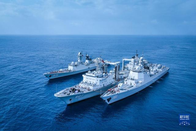 中國海軍第40批護航編隊駱馬湖艦(中)同時為岳陽艦(左)、呼和浩特艦進行補給(2月27日攝)。