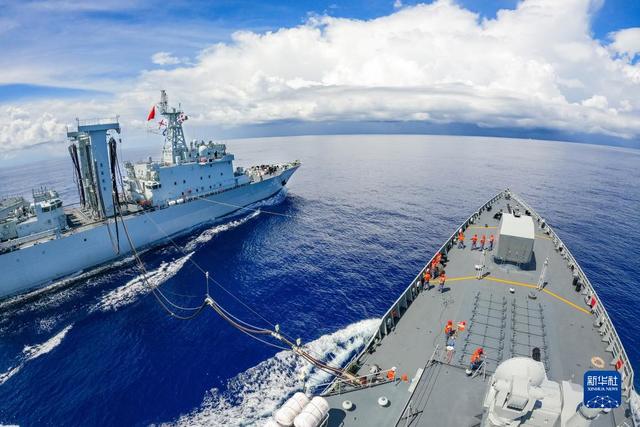中國海軍第40批護航編隊駱馬湖艦(左)通過橫向補給方式為呼和浩特艦進行補給(1月22日攝)。