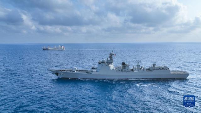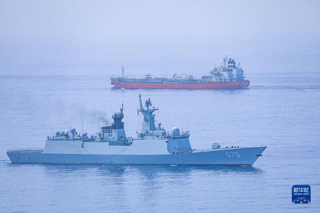 中國海軍第40批護航編隊呼和浩特艦(下)為“海洋之星”輪護航(4月9日攝)。